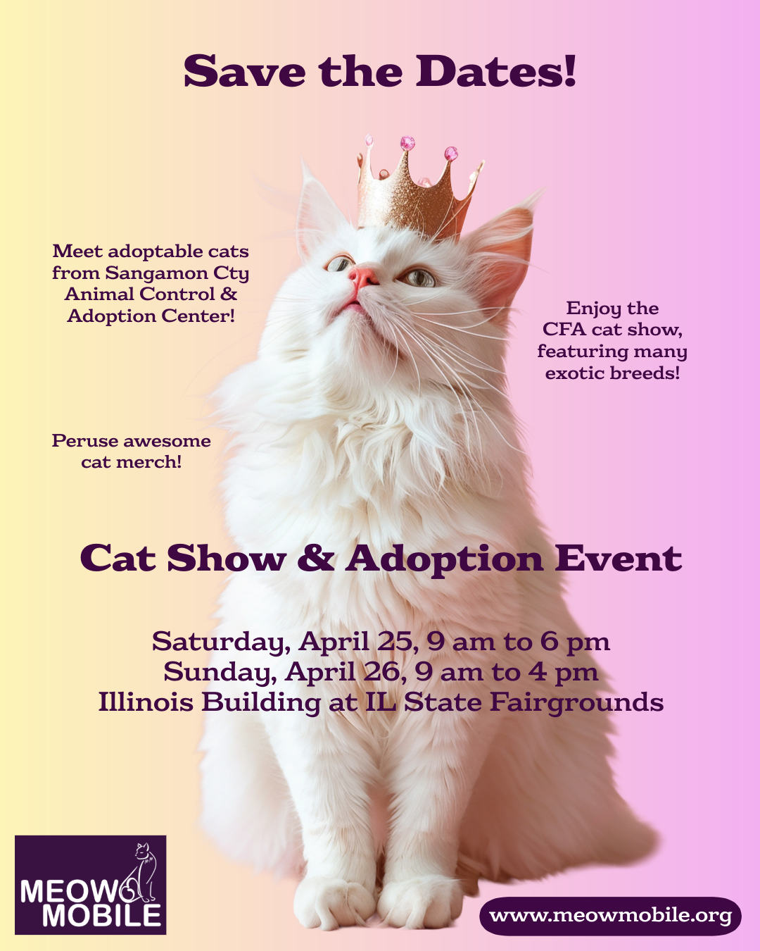 Come see us at the CFA Cat Show in Springfield, IL, on Saturday, April 25, and Sunday, April 26, in the Illinois Building at the Illinois State Fairgrounds. Meet adoptable cats from Sangamon County Animal Control & Adoption Center. Enjoy the CFA cat show, featuring many exotic breeds. Peruse awesome cat merch! We hope to see you there!